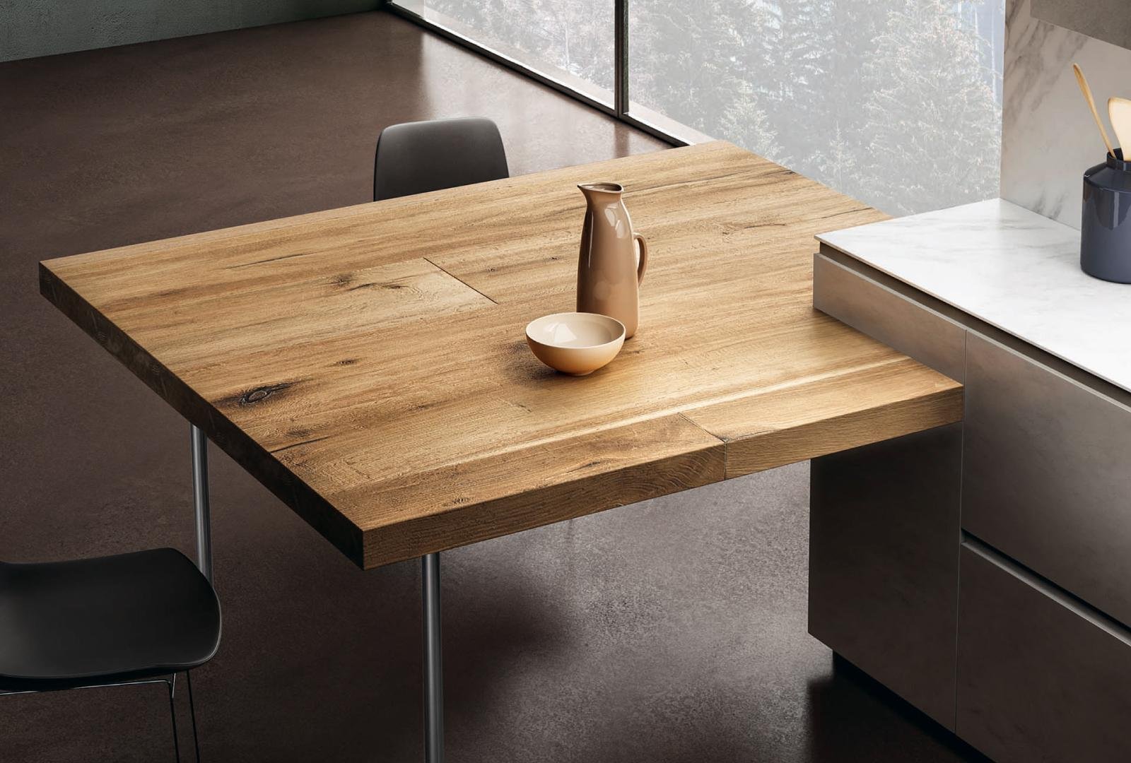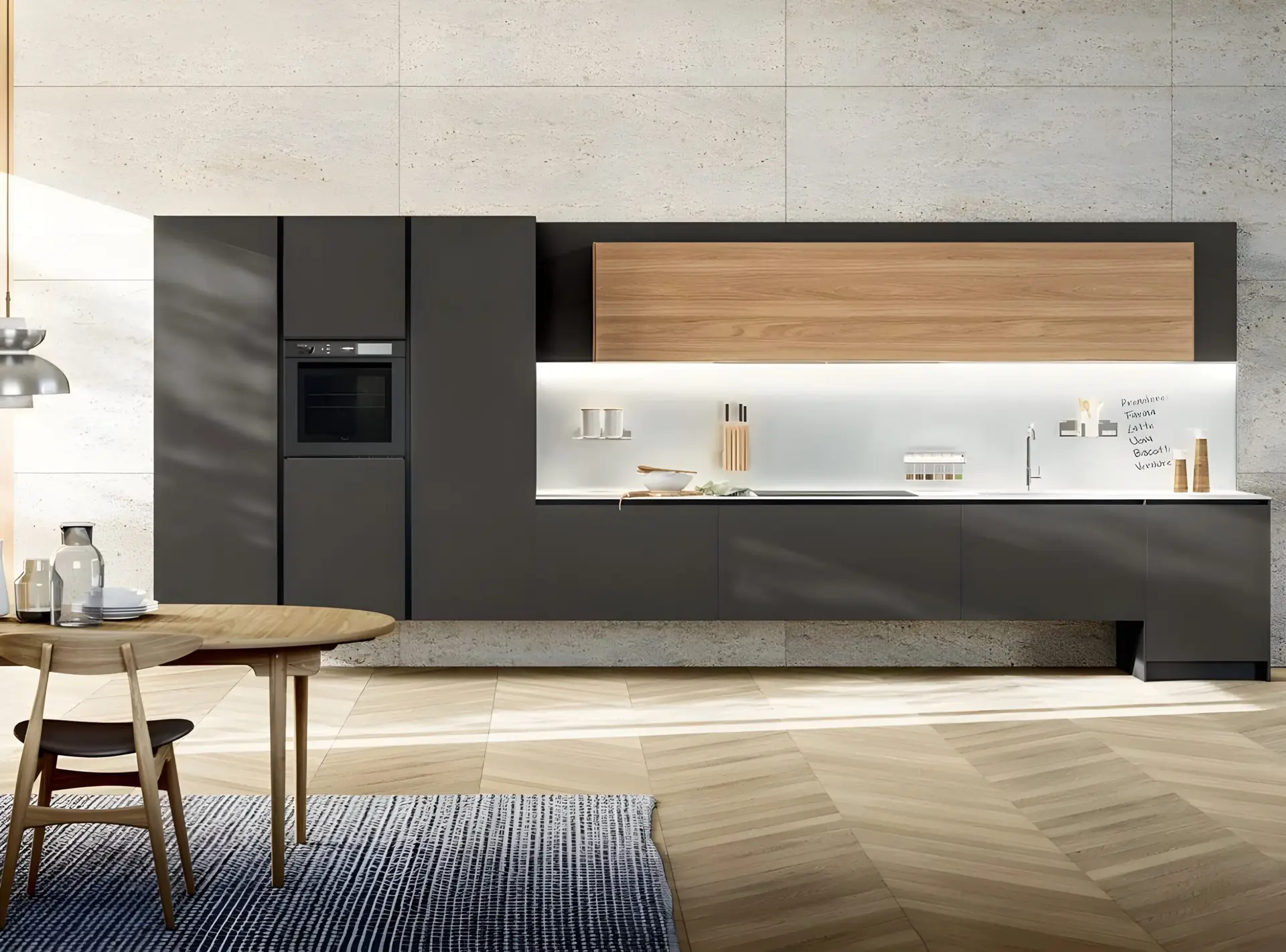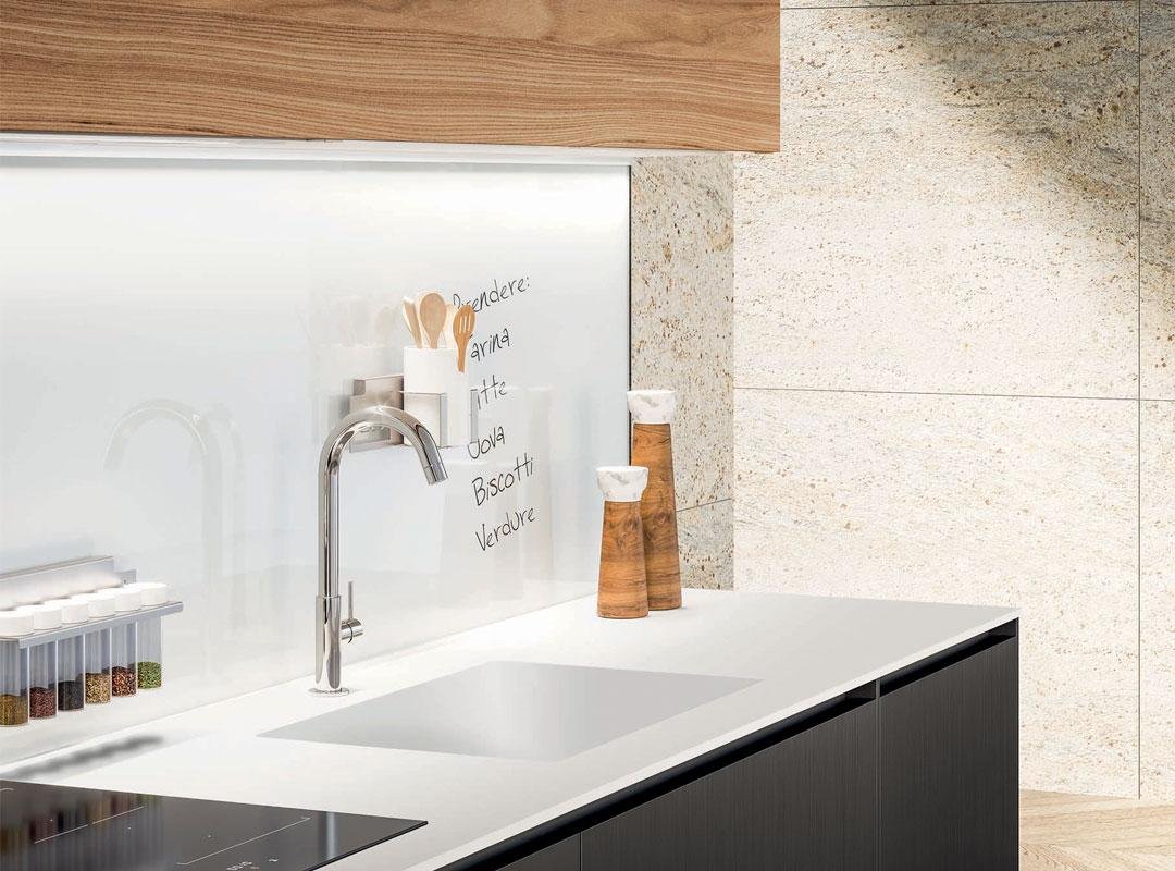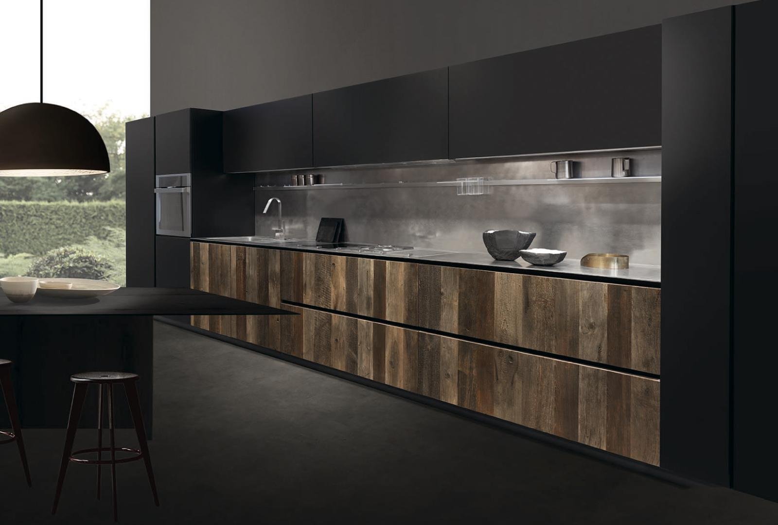 Linea Pure is an Italian manufactured kitchen known for its minimalistic design and high versatility. The handless feature creates a simplistic modern look and can be combined with traditional wood veneers.