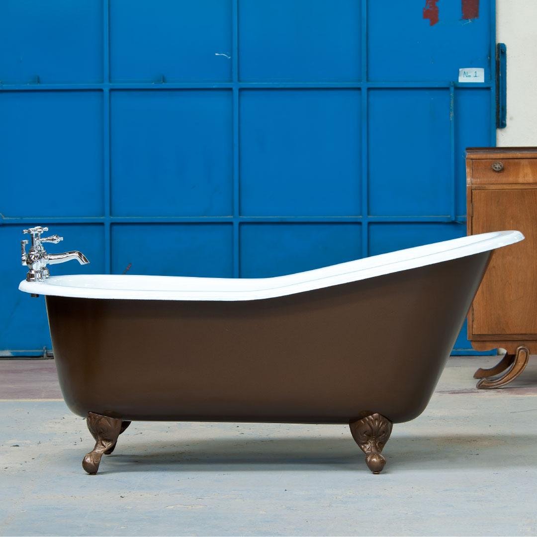 All of our cast iron baths can be painted with a bespoke finish , which allows you flexibility in design. The standard finish is white primer exterior with polished chrome feet.
