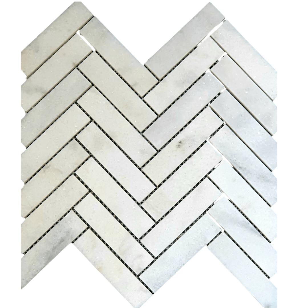 Stunning Star White Marble Herringbone Mosaic with honed finish available in sheets of 300 x 300 x 10mm.