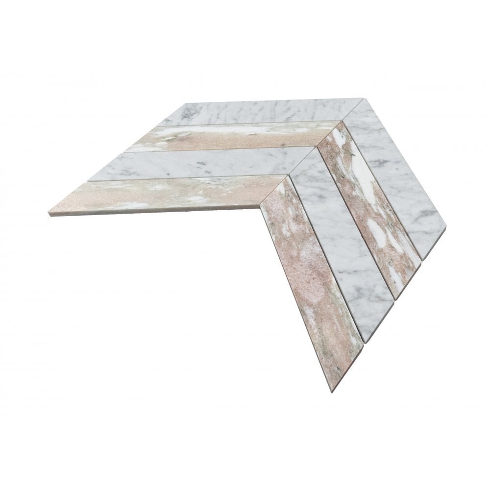Elevate your decor with the stunning Carrara C & Norwegian Rose Honed Marble Chevron Mosaic Tile. This exquisite tile combines the classic elegance of Carrara C marble with the delicate blush tones of Norwegian Rose, arranged in a striking chevron pattern. The honed finish offers a smooth, matte surface, enhancing the natural beauty of the marble while ensuring durability and easy maintenance. Perfect for walls and floors, this mosaic tile brings a touch of sophistication and contemporary flair to any space. Transform your home with this luxurious and stylish centerpiece.
