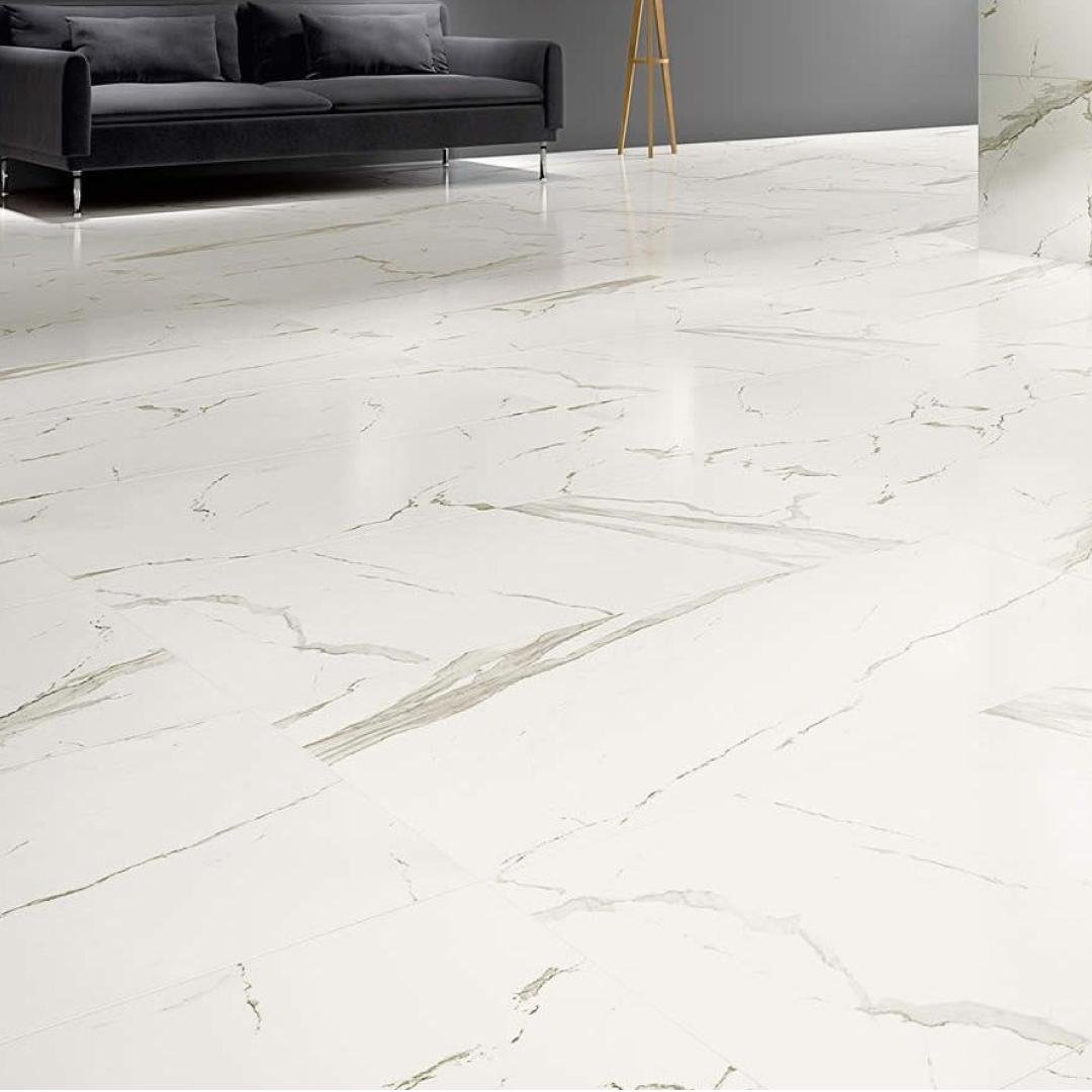 Calacatta Aragon features a pristine white background adorned with subtle grey veining, creating a mesmerizing tableau of contrasts. Each tile is a masterpiece, capturing the essence of natural marble with precision. The polished finish adds a glossy touch, reflecting light and enhancing the luxurious feel beneath your feet.