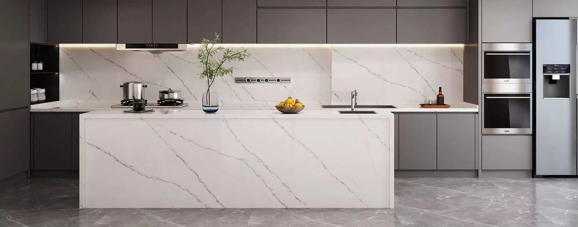 Atlas is a quartz that truly stands out from the rest. Its straight and parallel veins create a very unique and stylish look that can be blended in and portray a strong background in design projects, as well as the ability to be used as a feature piece.